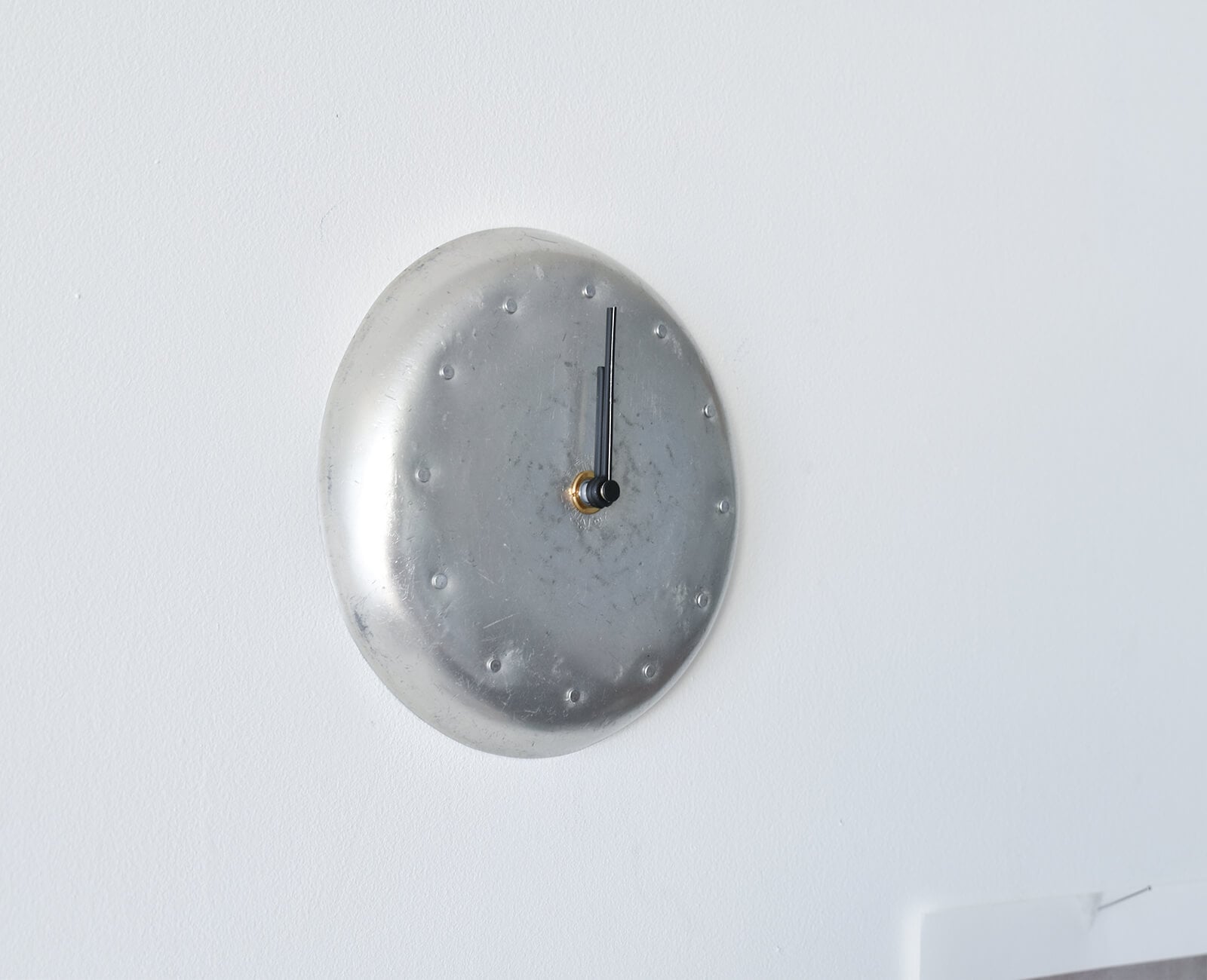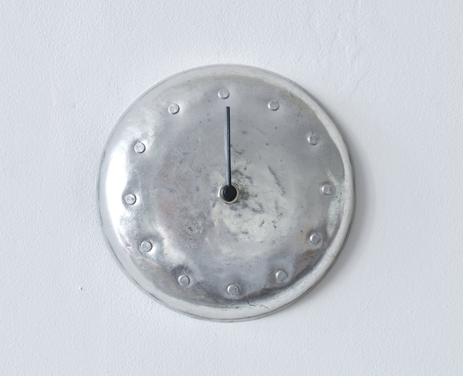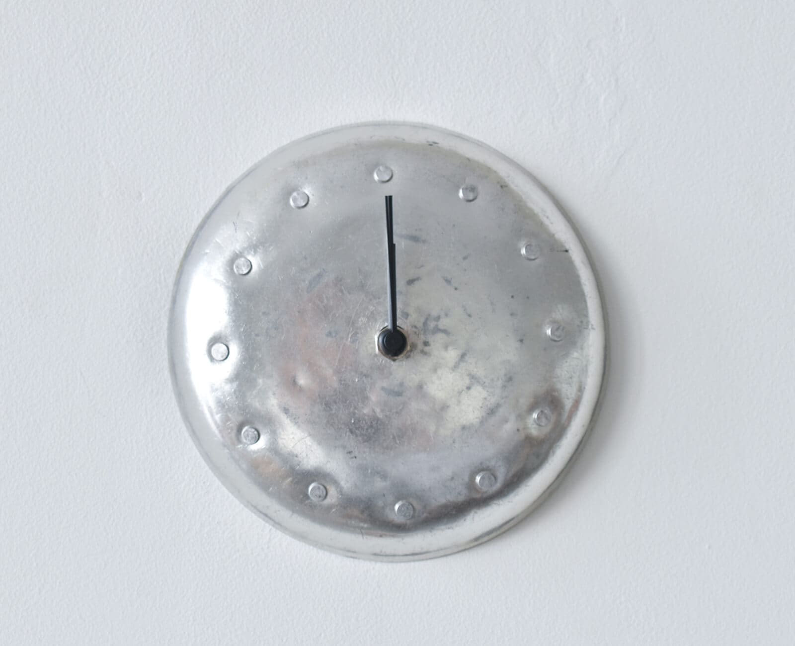 神奈川県で室内装飾作家として活動される、chikuniさんが作る壁掛け時計。 chikuniさんが作る作品は木材と金属を使うものが多いですが、このアルミクロックは古道具のアルミ皿を使った一風変わった時計です。