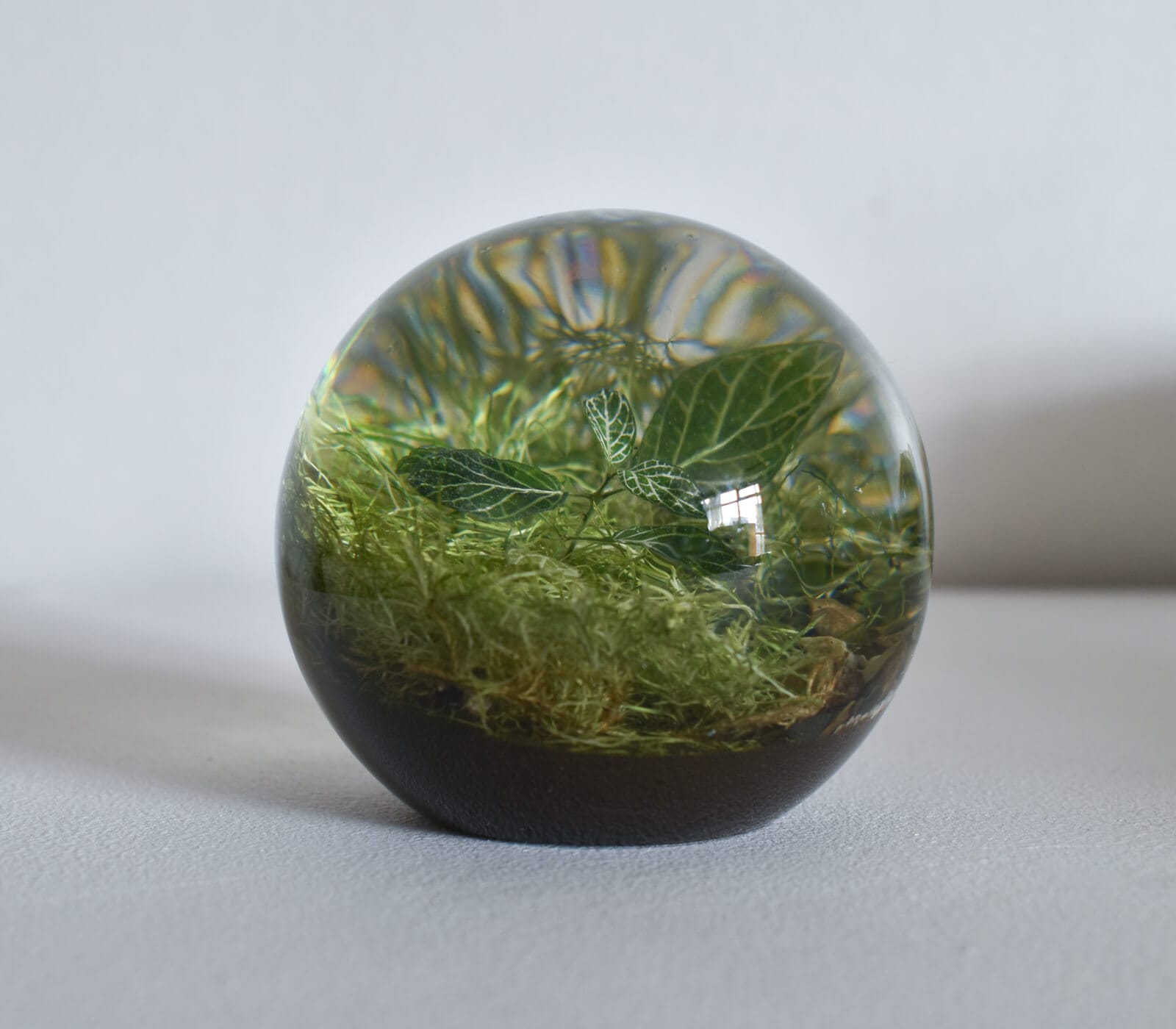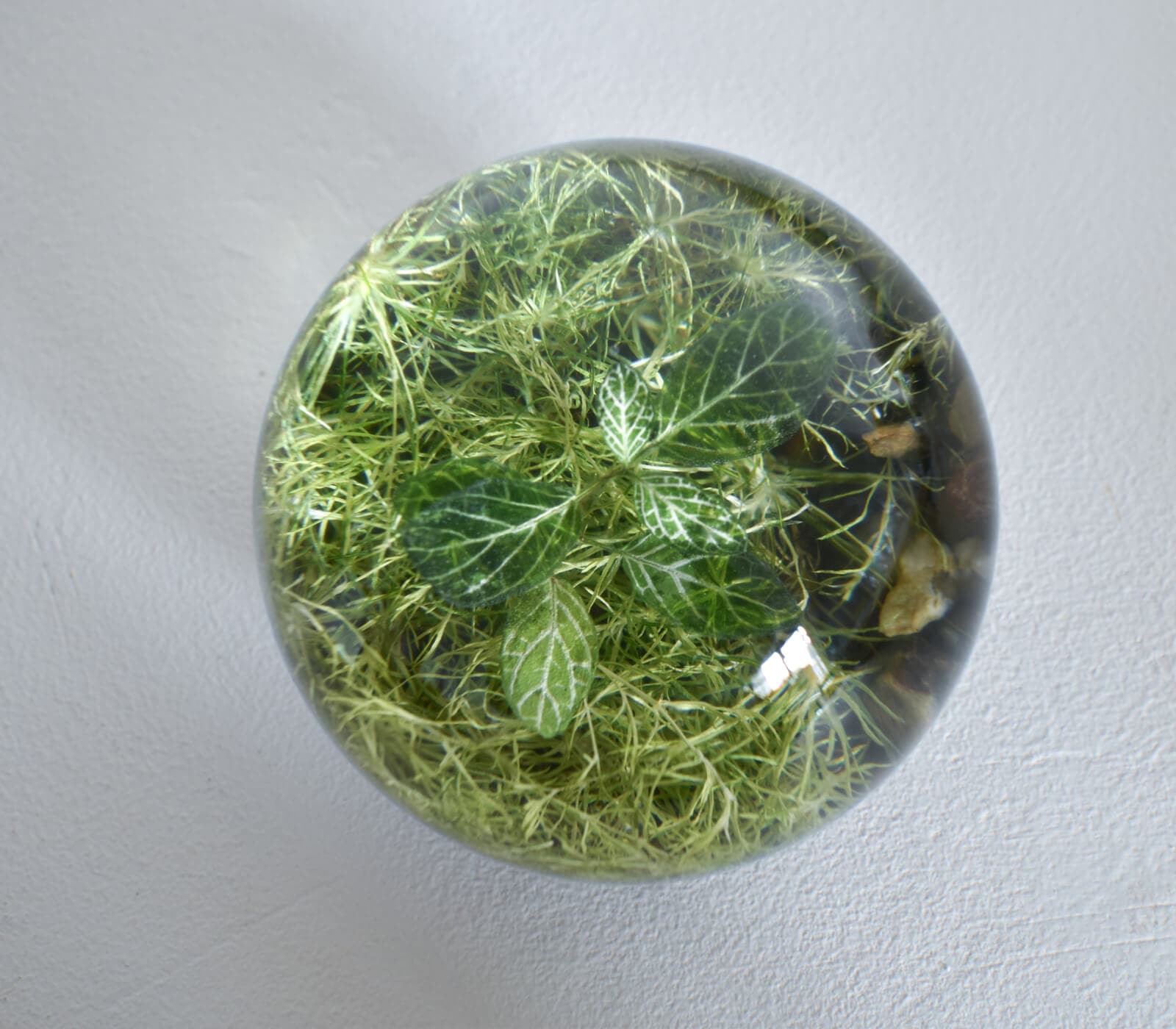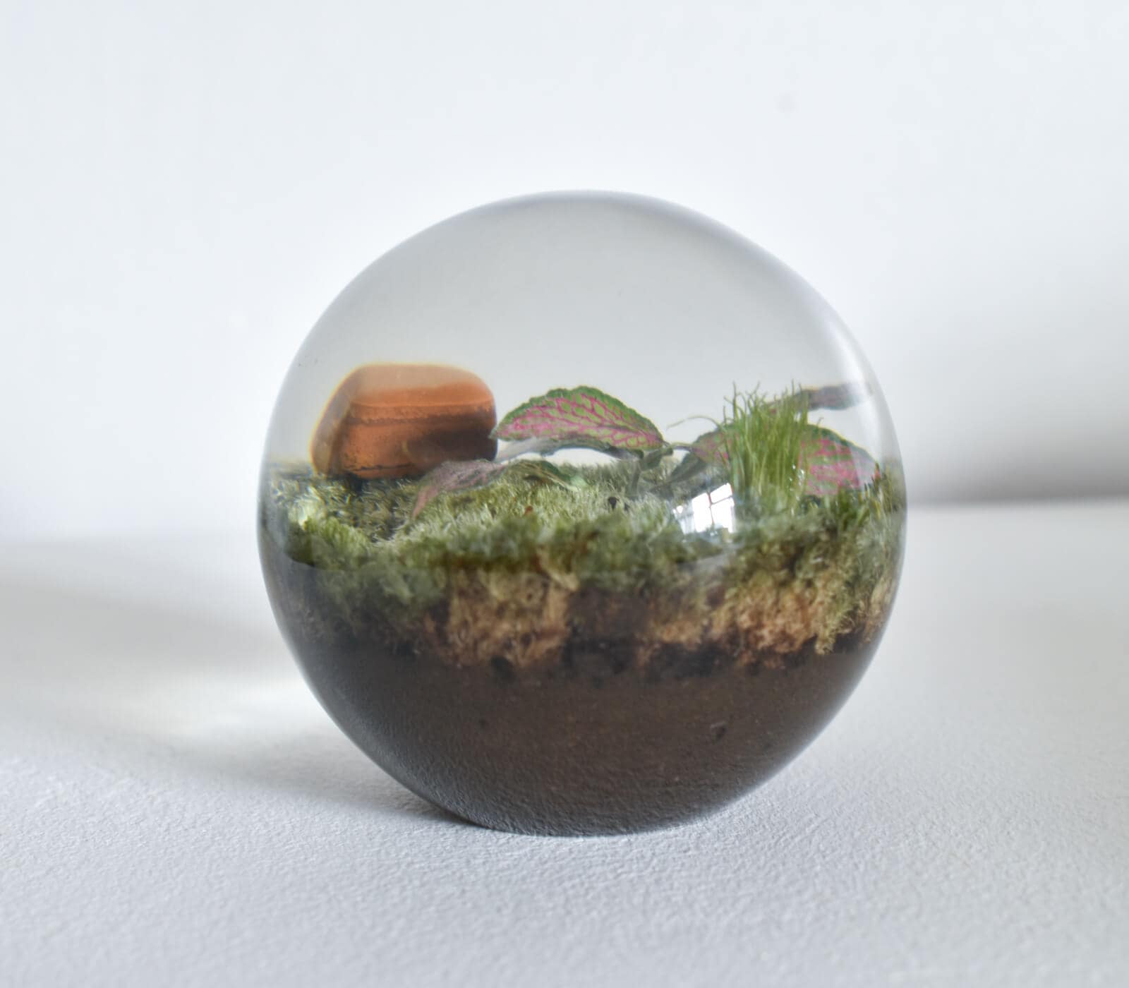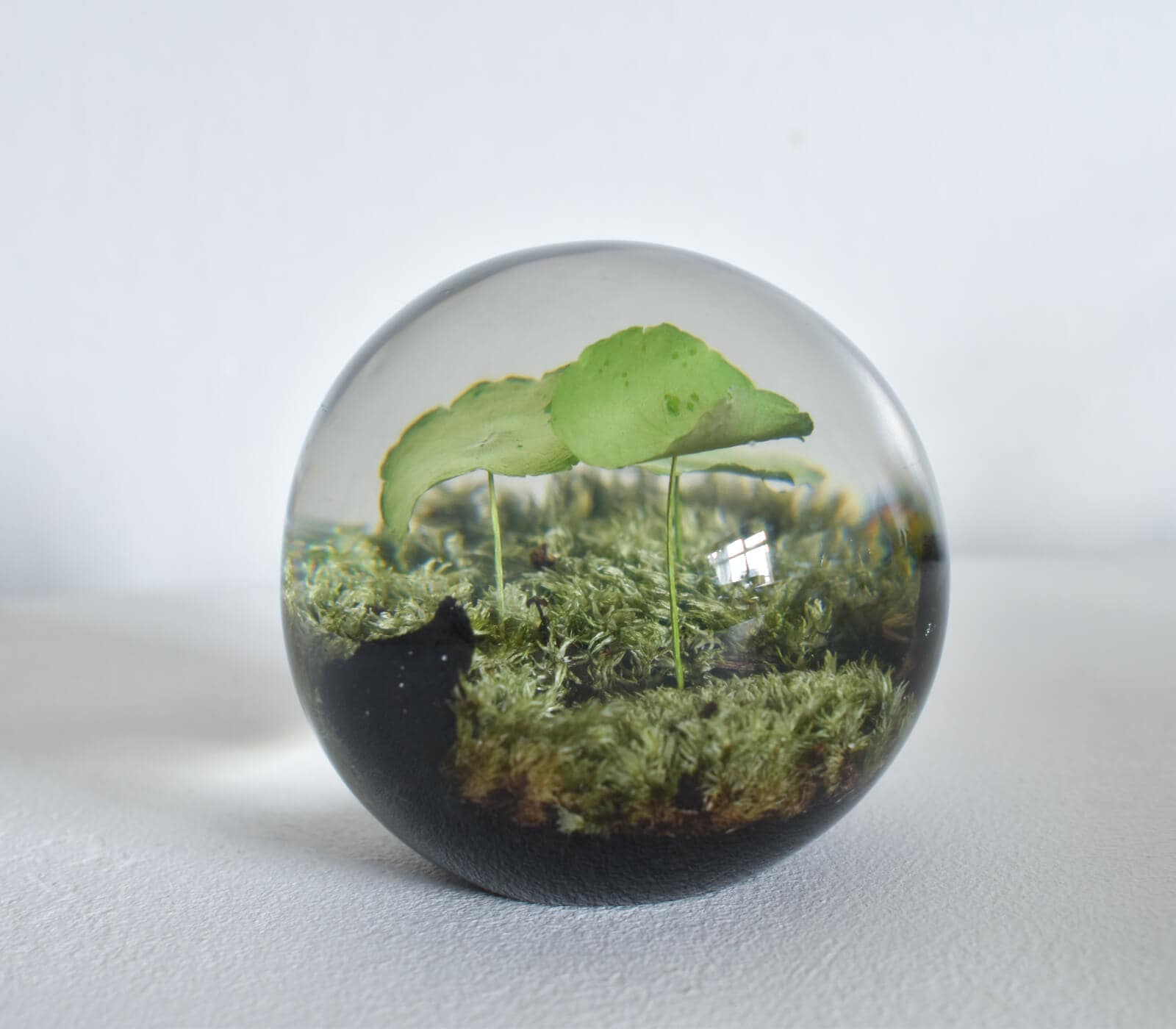 テラリウムのように、1つ1つ苔のような植物や石で構成されていて、覗き込むのがとっても楽しいオブジェ。まるで植物版スノードームのように球体の中に植物の世界観が広がっています。レジンだけれど、ガラスのように透明感抜群でキラキラとしていて、ついつい眺めていたくなるアイテムです。