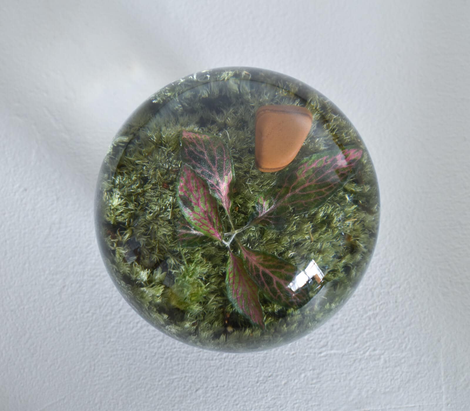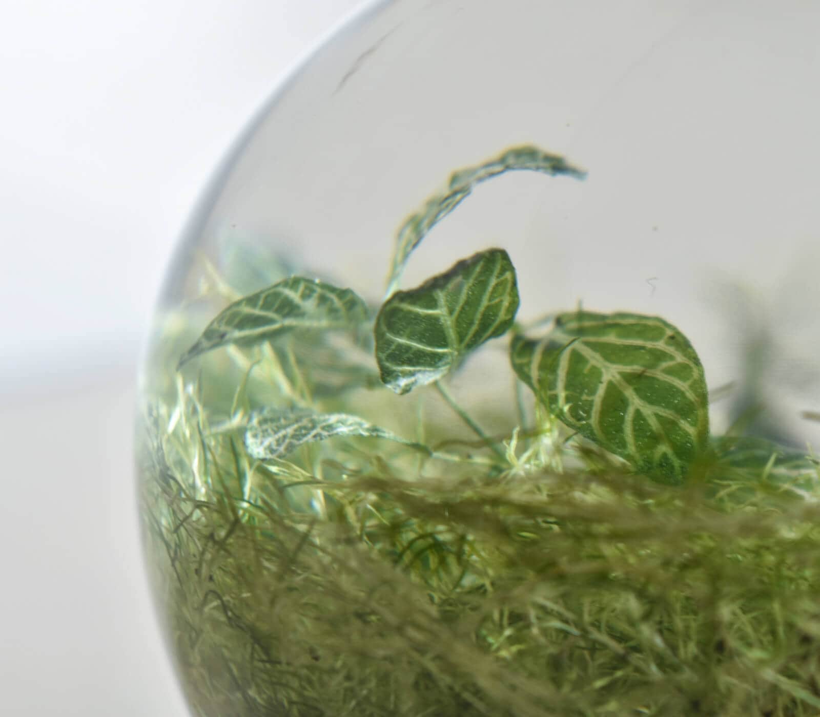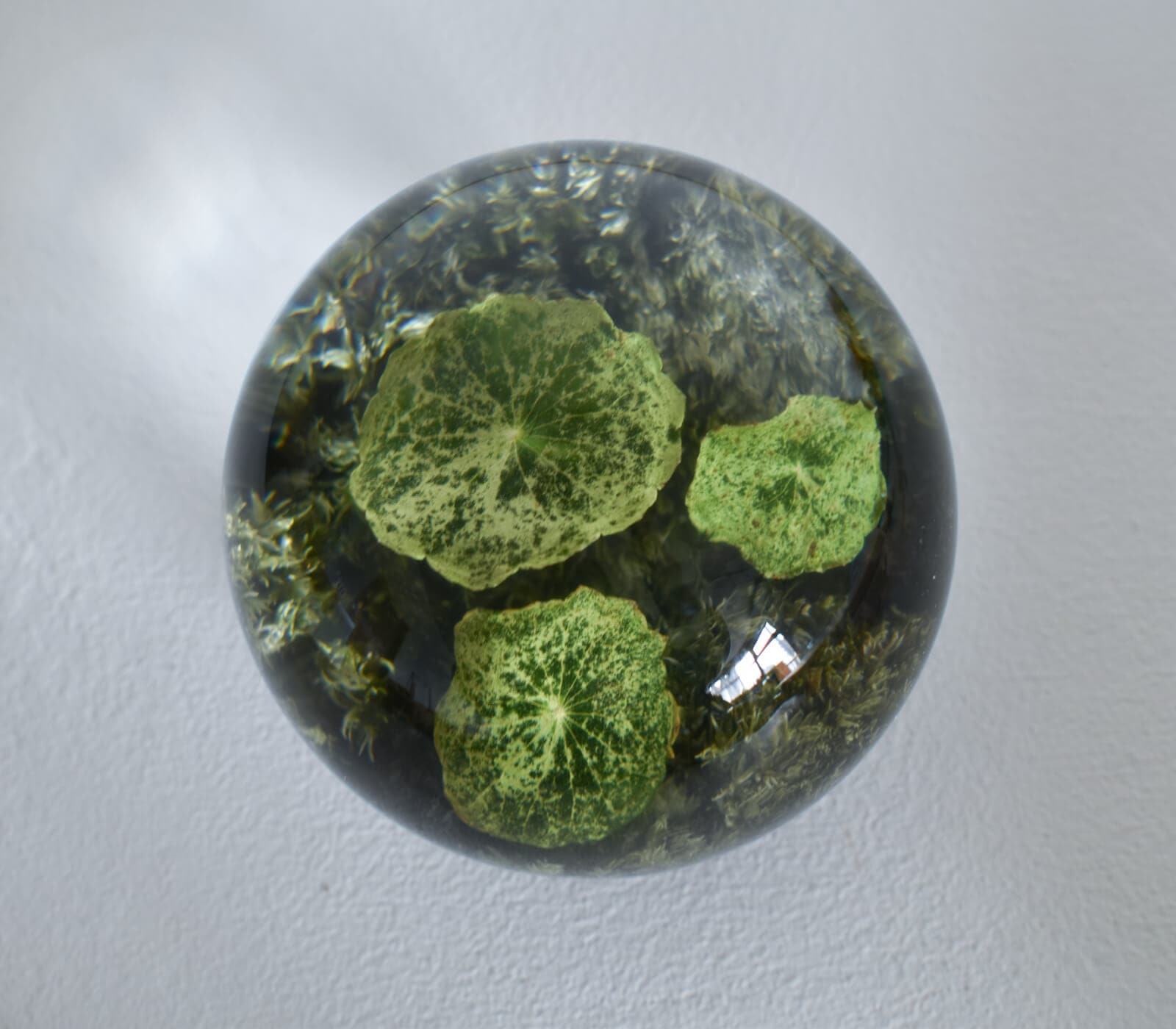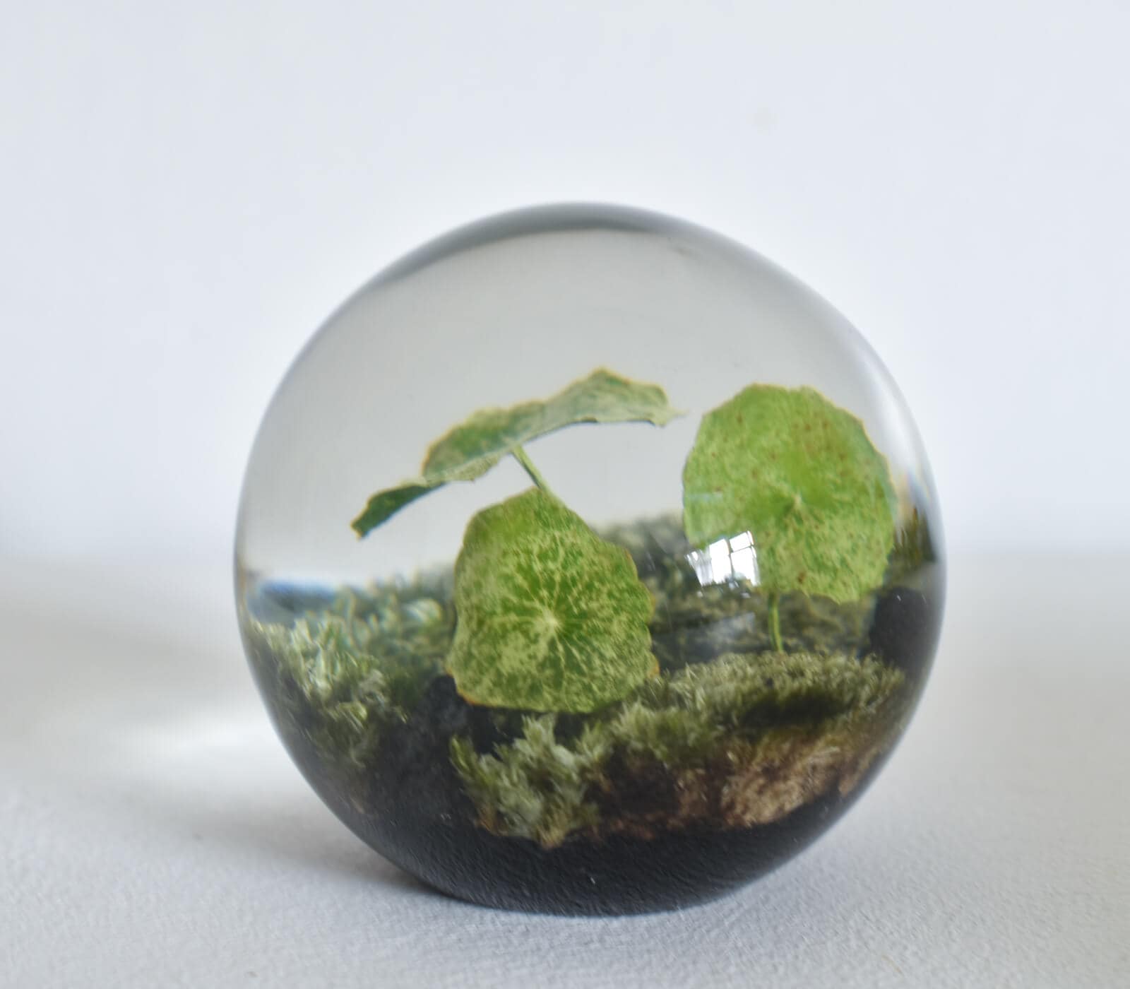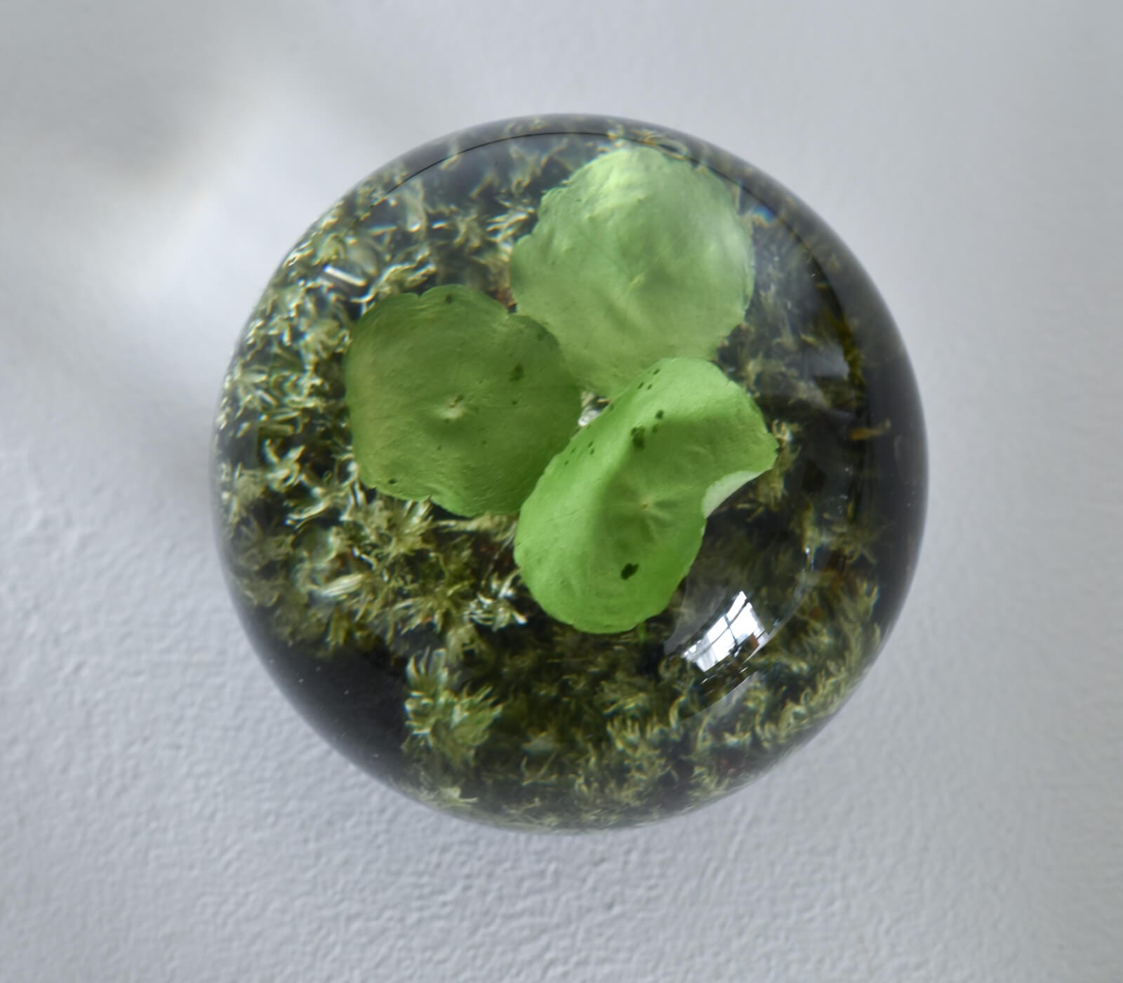 テラリウムのように、1つ1つ苔のような植物や石で構成されていて、覗き込むのがとっても楽しいオブジェ。まるで植物版スノードームのように球体の中に植物の世界観が広がっています。レジンだけれど、ガラスのように透明感抜群でキラキラとしていて、ついつい眺めていたくなるアイテムです。